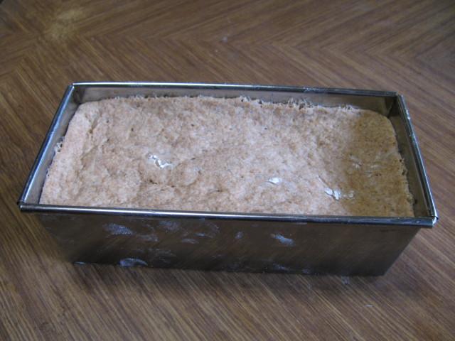 ⑥こねた生地は、手につかないよう打ち粉を振って、鉄製のパウンドケーキ用型枠に押し込む。