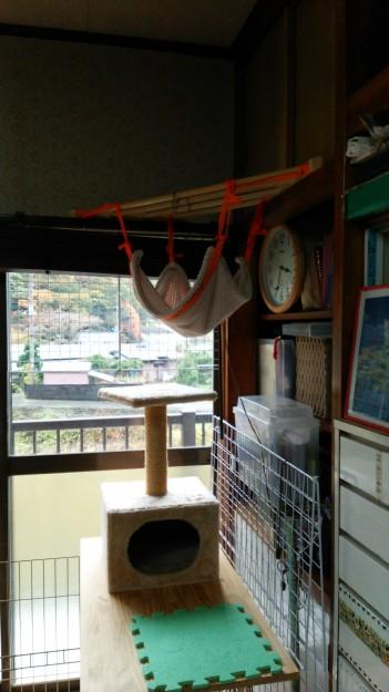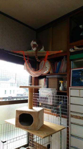 で、今度はゲージの上の棚に縛り付けて、着けて見ました。