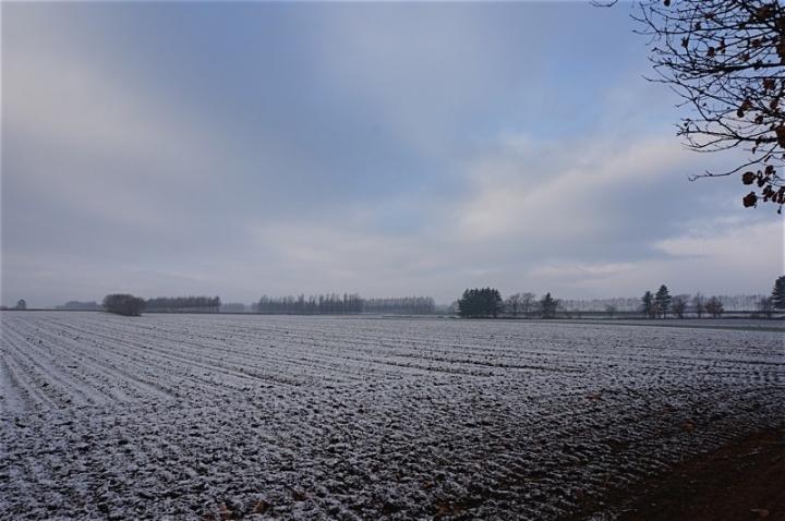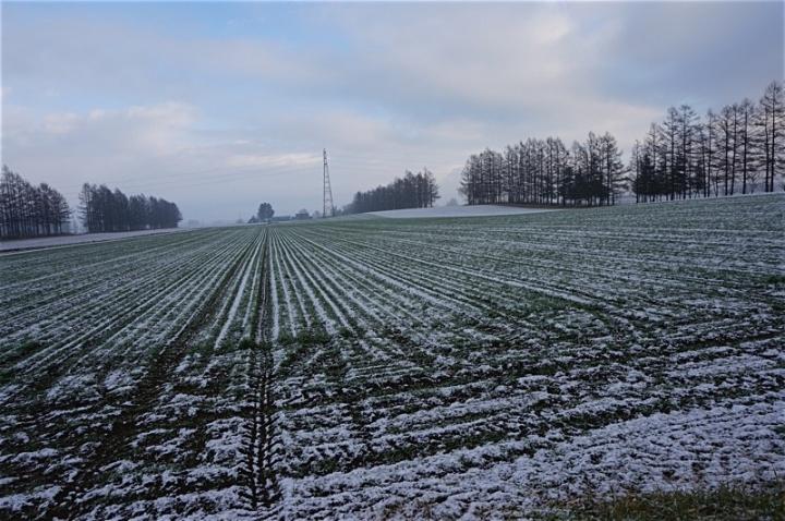 ひと月半程前に蒔いた秋蒔き小麦の緑の新芽の上にも、ちょっと積もっています。