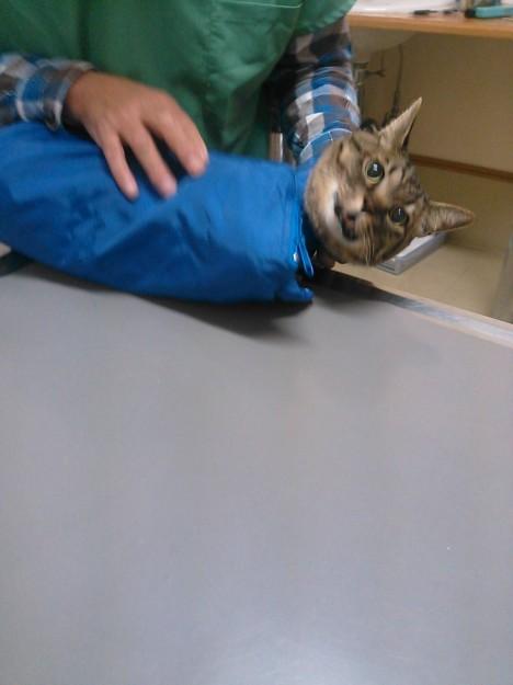 麻酔を覚ます注射。ここで先生失敗。即麻酔が切れるわけじゃないけど、猫袋に入ったまま注射しちゃったから焦る焦る。激怒するモナを宥めながらなんとか出しました。