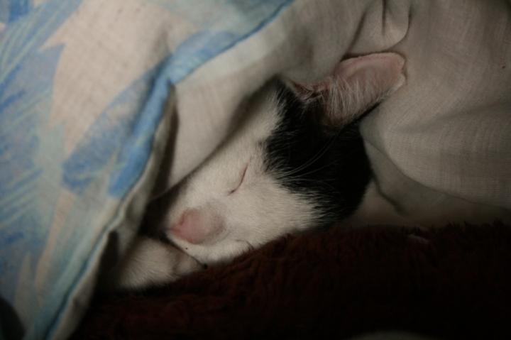 (↑布団の出入りをなんどしてもねたままのチロ、部屋を出るたびに、全身ころころと手洗いをする自分)