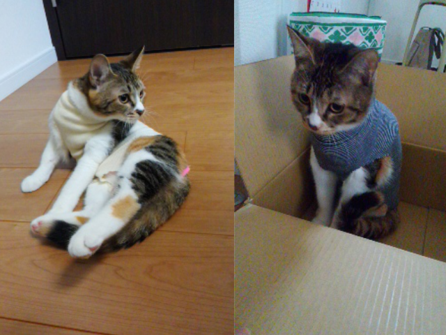 手術後のルナちゃん左側写真手術当日(12/8)。右側写真抜糸後。