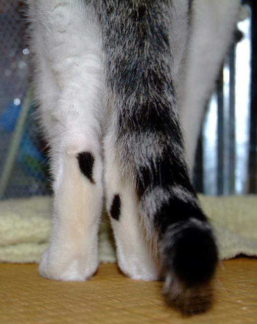 白い後ろ足にある黒斑点...。なかなか写真に撮らしてくれない場所なんだけど、やっと。