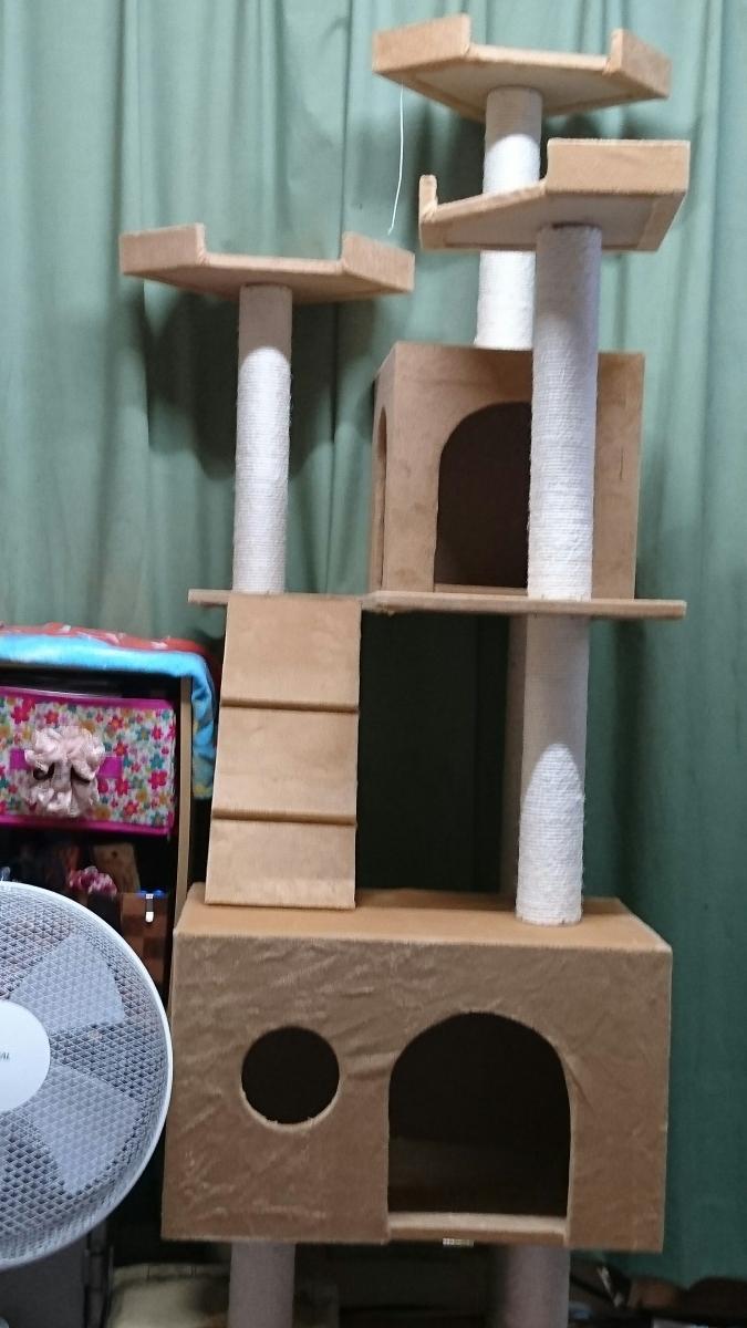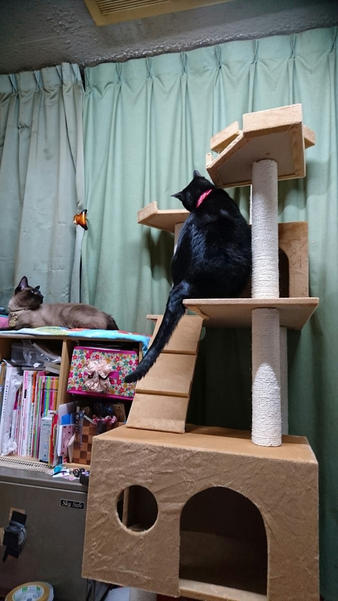 作っている最中にタワーについているネズミのおもちゃを見つけ、どこかに持っていこうとしてた😅