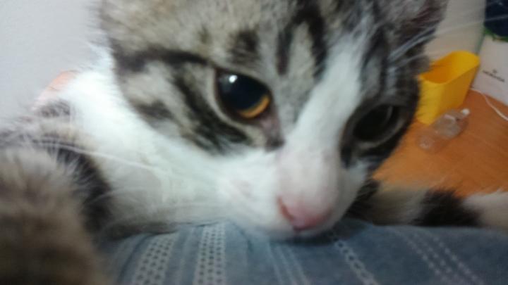 人の腕の中でへそ天でぐるぐるいいながら( ˘ω˘ )スヤァ…