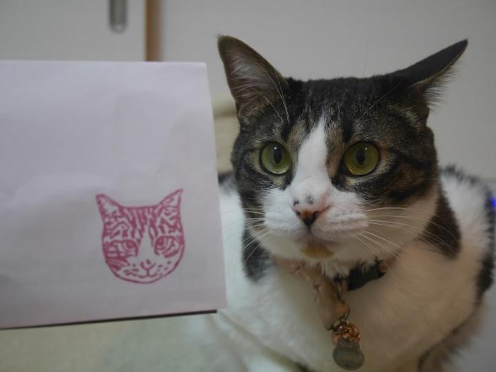 なんと、作成者のたけだみなみさんが、「できそうな絵があったので」ということで、ネコ写から写真を拾ってベリーでスタンプを彫ってくださいました!