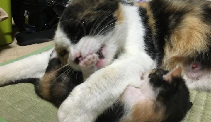 母猫が、子猫の首根っこを掴んで、ガジガジと噛みだしたからです。