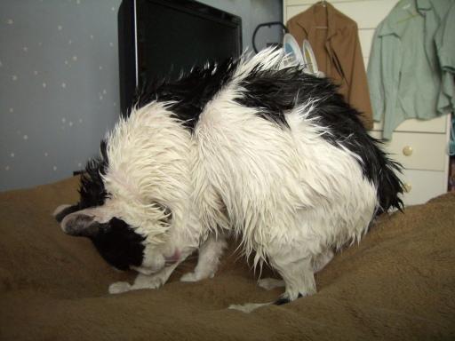 シャンプーもすすぎも済ませ体を拭いて、お風呂場から出た直後のチャム。