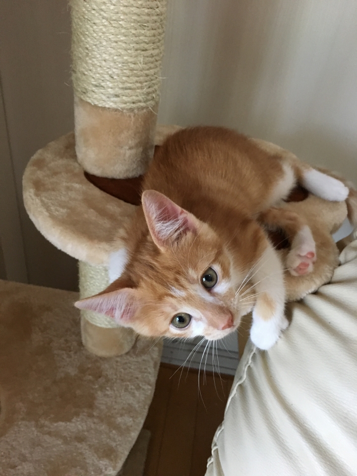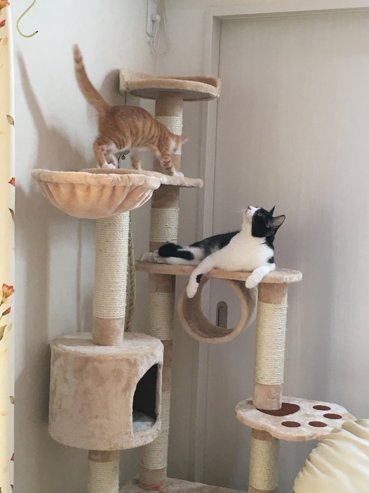 最後までビビって登れなかったハナちゃんも(足が曲がっているので登りづらいってものあったのかしら?)最近ではキャットタワーでくつろぐ姿を見かけます♪( ´▽`)