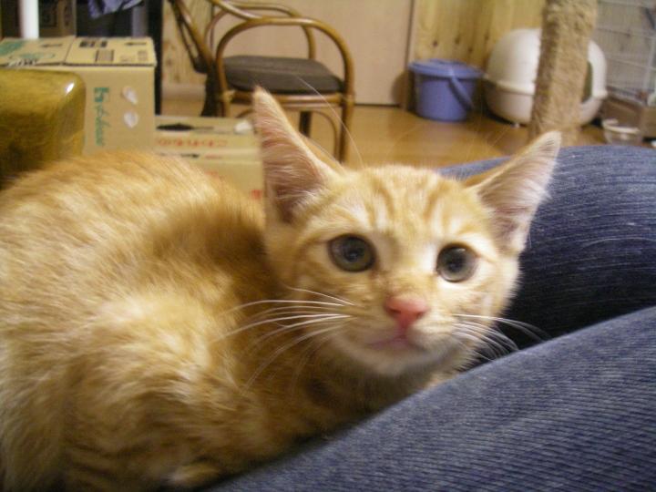 茶トラ君です。運がよい子です。先住猫とワンちゃんが居るご家庭です。御子さんもいますが、男の子は「僕の弟が出来たよ。可愛いんだよ名前はもも吉くん凄くかわいいんだ」と教えてくれました。先住猫ちゃんもわんちゃんも、なめなめして熱烈大歓迎でした。威嚇もなくずーっと一緒に暮らしていたような感じです。