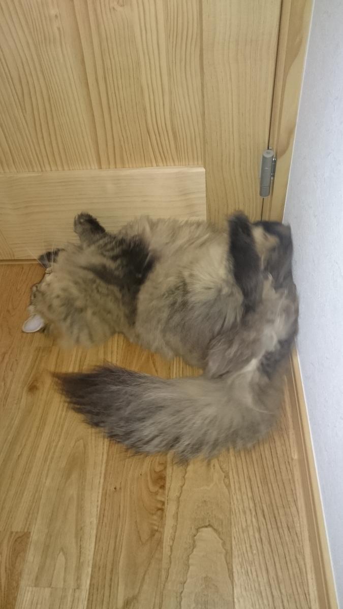 帰宅後はトイレの前でゴロゴロごん太君