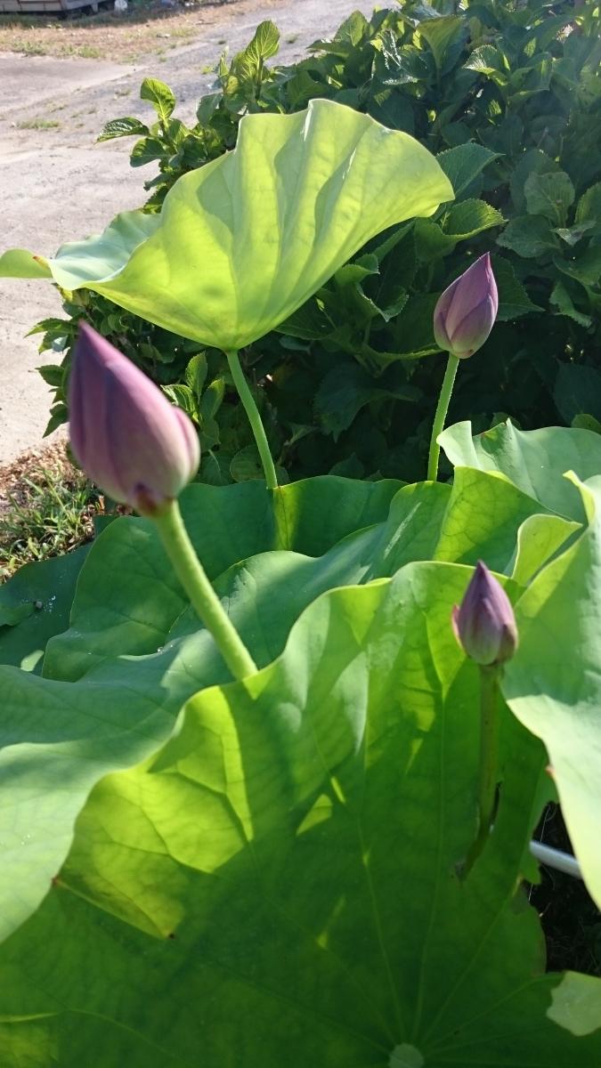 実家の蓮の蕾が沢山出てきました。中古の風呂釜は沢山土も入るし金魚も幸せそうです。