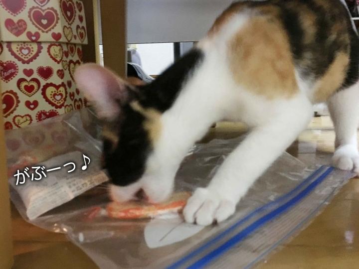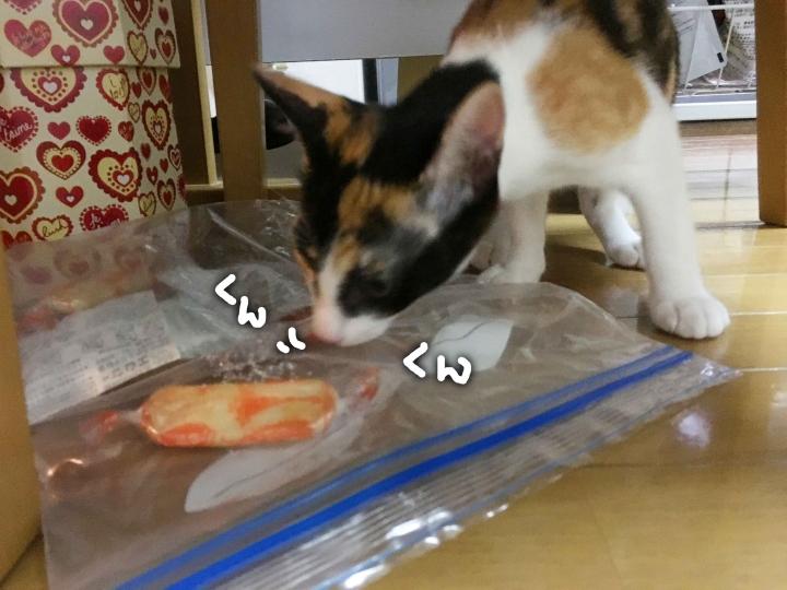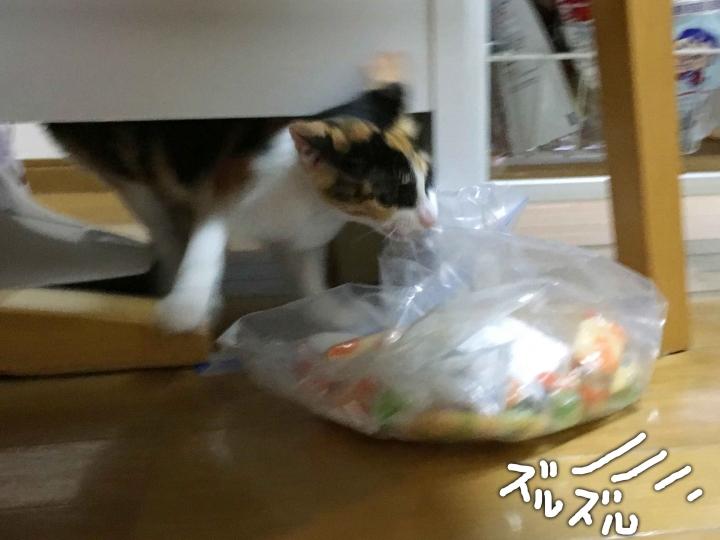 こちらの撮影にも気付かず、今夜はいそいそとハッピーターンの入った袋を運び出しています。