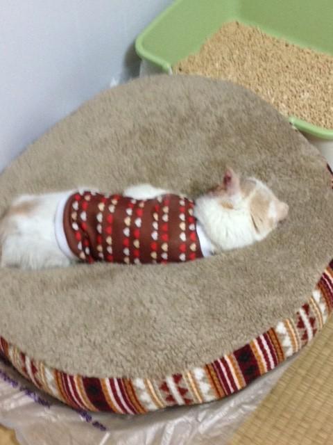 しかし新品なため、こなつの3.4キロの重さではクッションの反発に負け、寝返りしようとするとずり落ちたり転げたりしている。