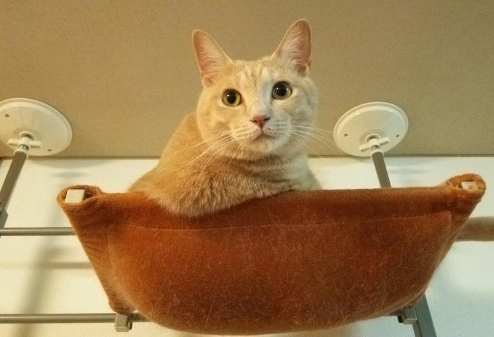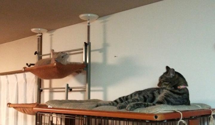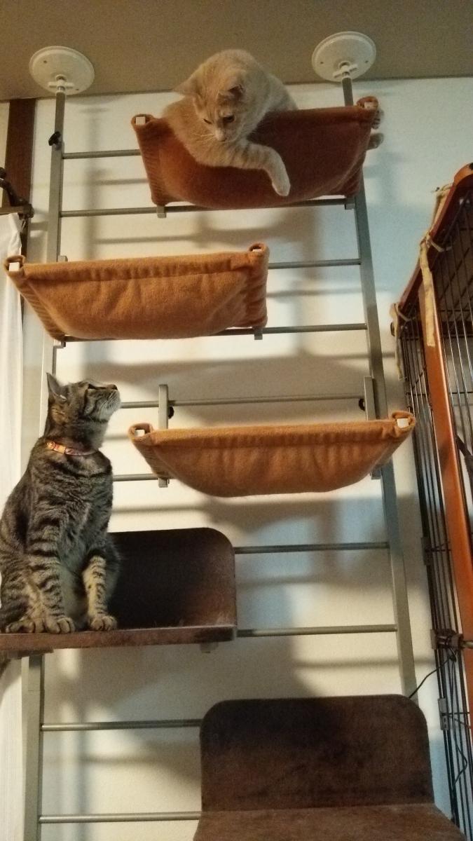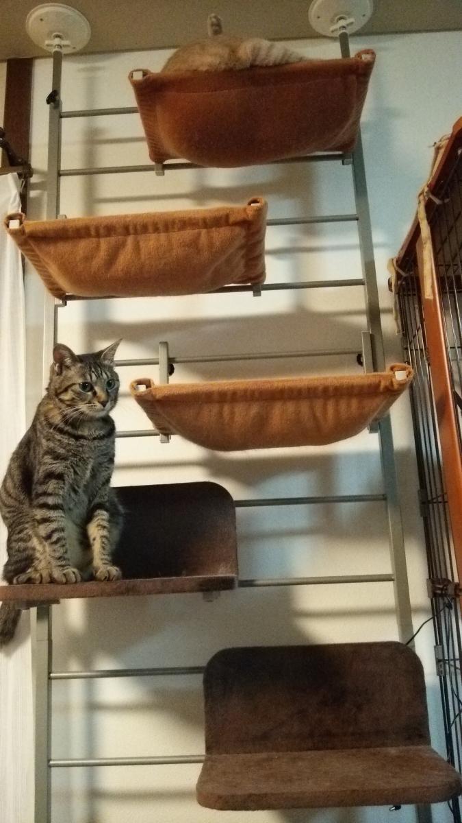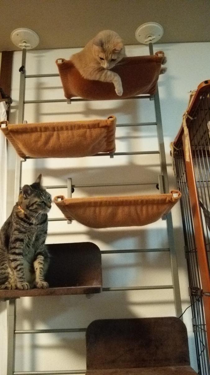 ずっとすずが独占していたキャットタワーの天辺に、ずいぶん久しぶりにニコちゃんが入っています。