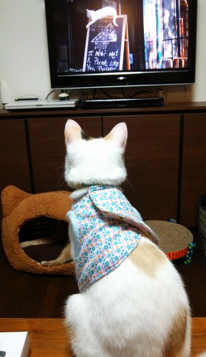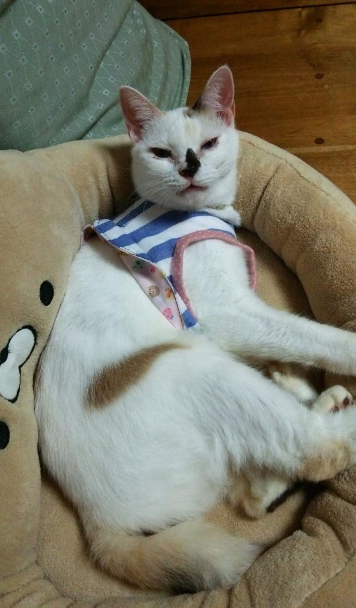 背中の傷が治りかけて痒いのか、後ろ足で掻いてしまうので、背中の部分が穴だらけのボロボロです。