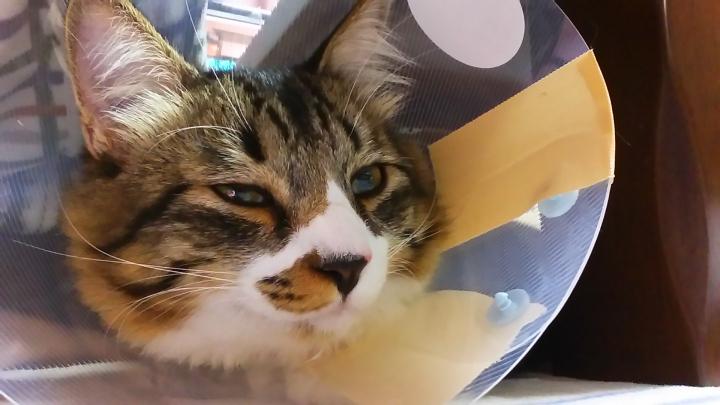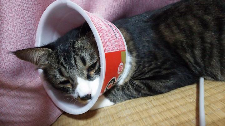 ↑手術が終わりお家に帰ってきました。傷口舐めたらいけないのでエリザベスカラーの代わりに麺づ●りのカップで作ったカラーをつけられたにーちゃん。やっぱり精神的にかなりダメージを負ったらしくとても静かでした…。ちなみに病院ではかなりシャーハー怒っていたようです…( ;∀;)
