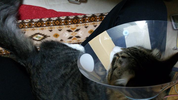 ↑二日目の夜…保護してから一回きりだった膝乗り…!!!手術した猫によくある現象ときいてはいましたが、突然のことに嬉し恥ずかし困惑する私(((;゚Д゚)))20分くらいそのまま寝ていました。カラーがあたって腕が痛くなったけどめったにないデレが嬉しくてずっとニヤニヤしてました←