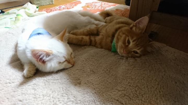 迷惑そうだから止めに入って2匹を離すと、同じ格好でコテッと寝ている。