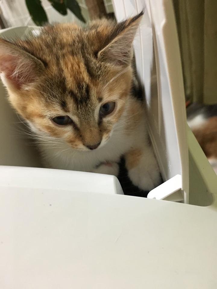 最近空気清浄機の吹き出し口にはまり込むのがブームらしい