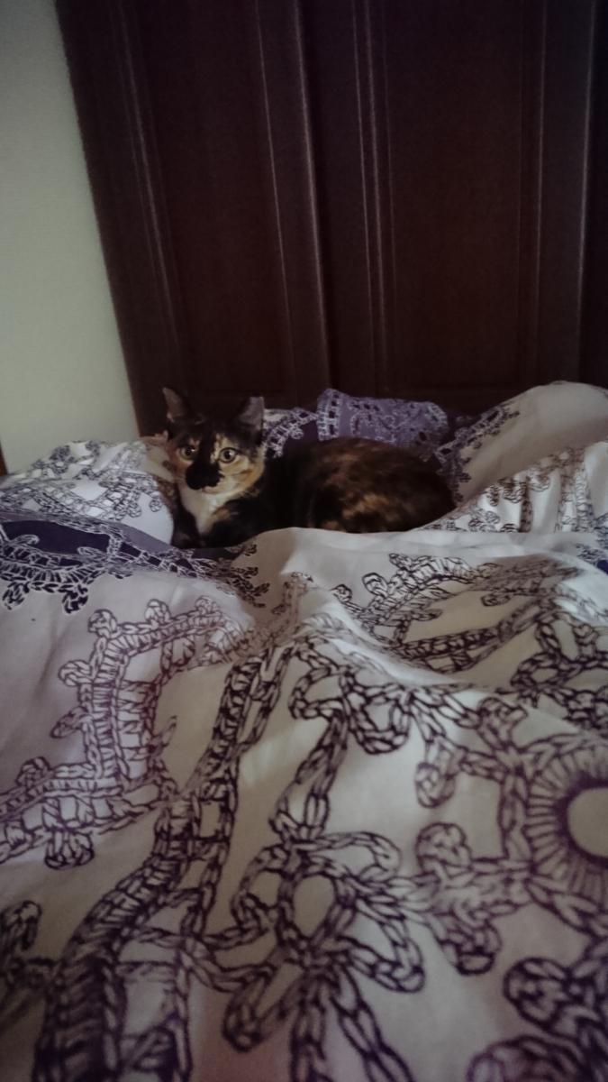 朝から私の足元にルーク♂が入り、ミルク♀が入り、でも我が家の捕まらない茶々は、ルーク♂の後入りたい。