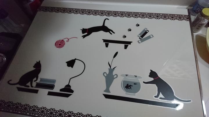 無いなら作れないかしらがモットーなので、DAISOのウォールステッカーでこんなふうに黒猫さんをペタリ。