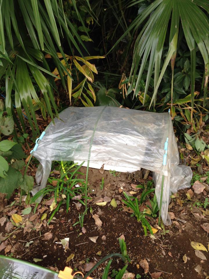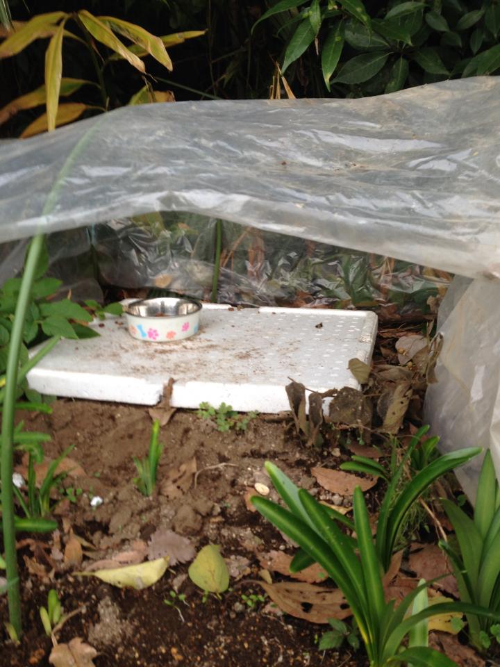 路線バスも通りそこそこ交通量の有る県道を横断して元の家に餌を食べに行かないように、家庭菜園に餌を切らさず置けるように、家庭菜園用の資材と発泡スチロールの板で餌置き場整えました。