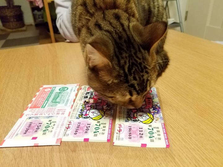 これで一等が当たったら、ニコちゃんには1ヶ月間ウマウマゴハン&おやつに焼きかつおっておとさんが言ってたぞ~😆