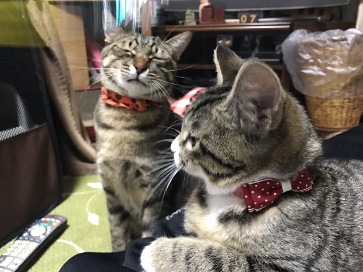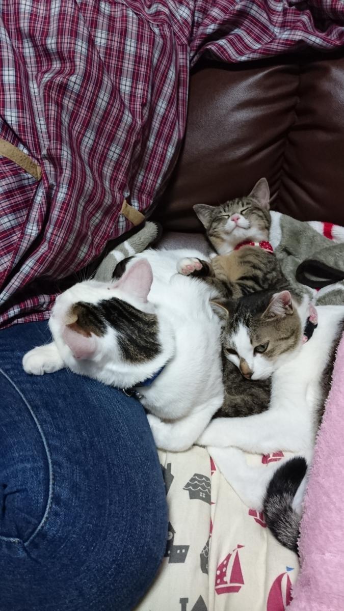 むぎちゃんとは距離をとってたけど、最近ではひっついて寝るようになり…