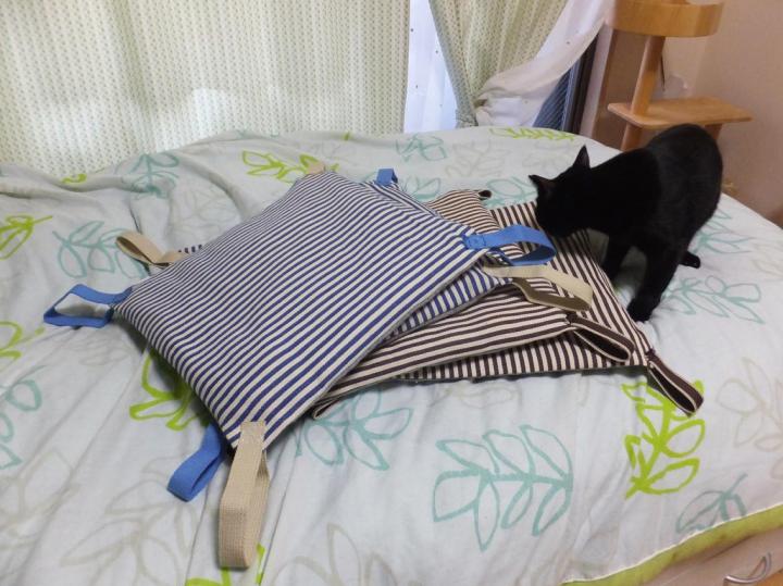 100円ショップで購入した座布団に取手をぬいつけて、ニャンモックにしています!!