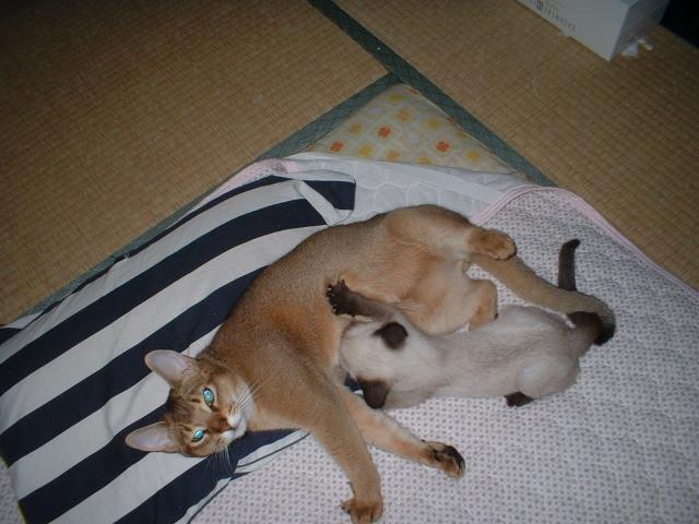 (写真1:なぜかマオ(アビシニアン雄9ヶ月)のゴマ粒ほどのおっぱいをまさぐるヒナ(シャム雌5ヶ月)
