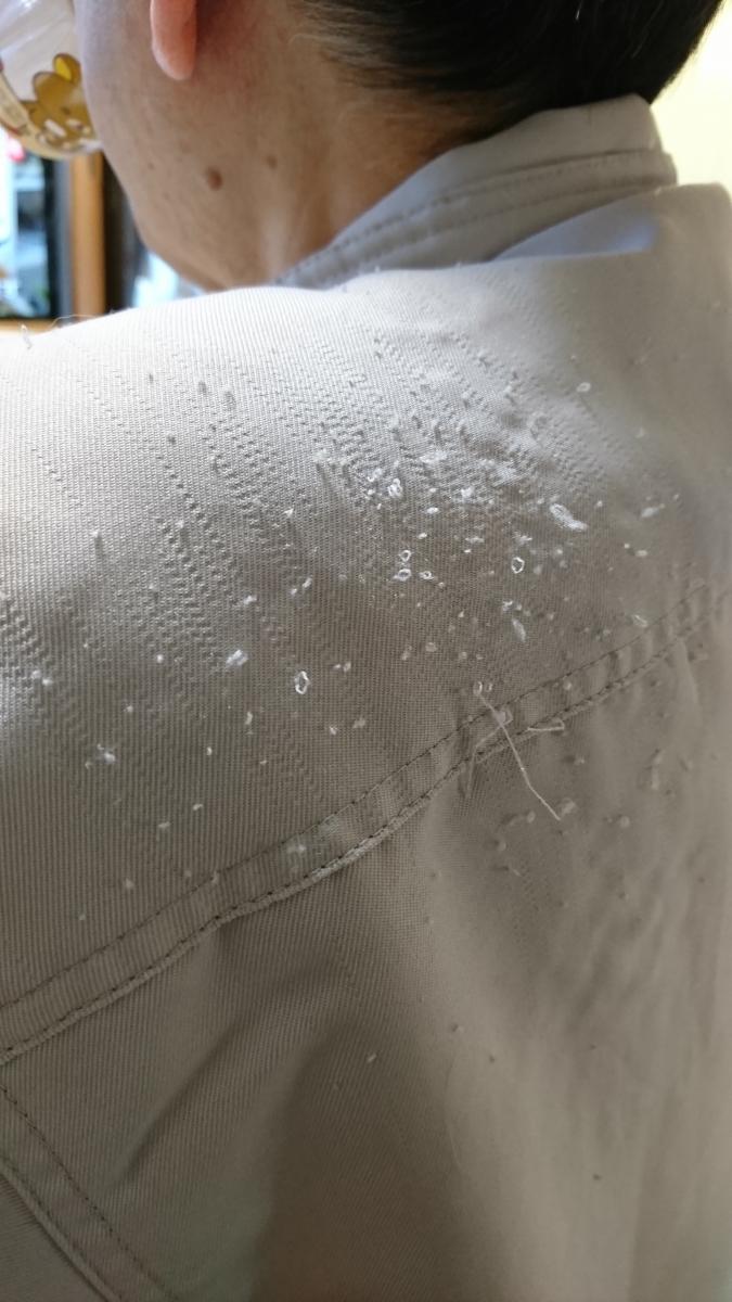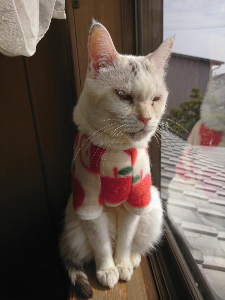とめさん、グルーミングハゲ予防に手づくりの洋服を新調しましたが、ちょっと小さかったね😅