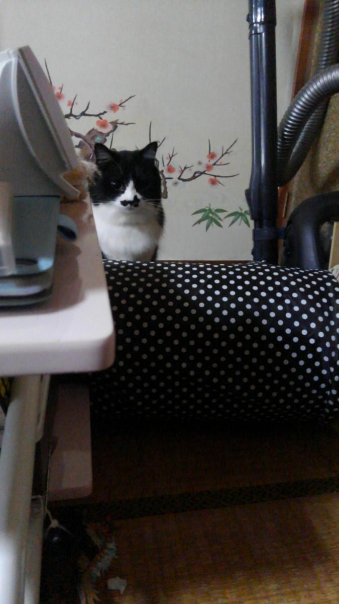 ↑朝、座椅子の後にいるちろるを狙うちょび太