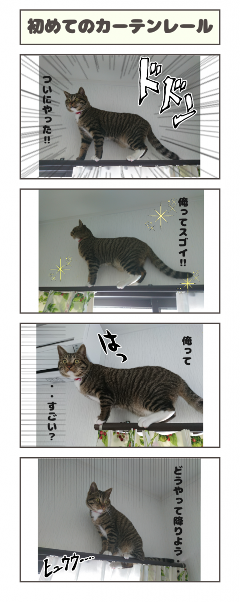 今日はカイ君が初めてカーテンレール登頂に成功したので