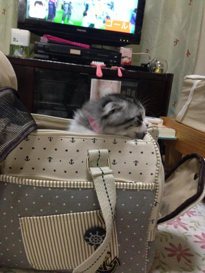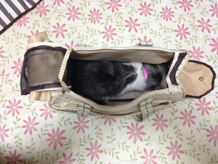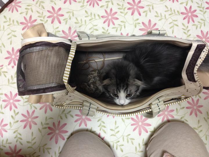 キャリーの中は楽しいと思ってもらえるよう、初めてのおやつ「チュール」を♪