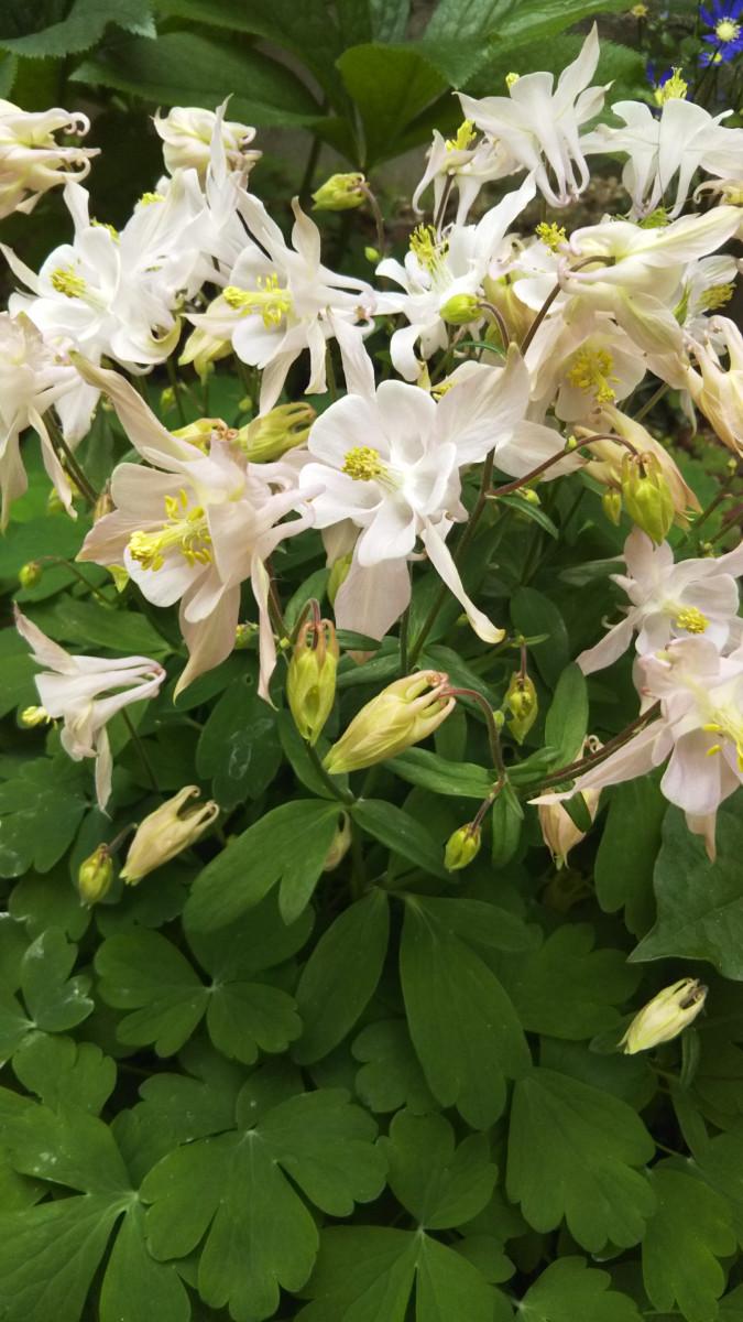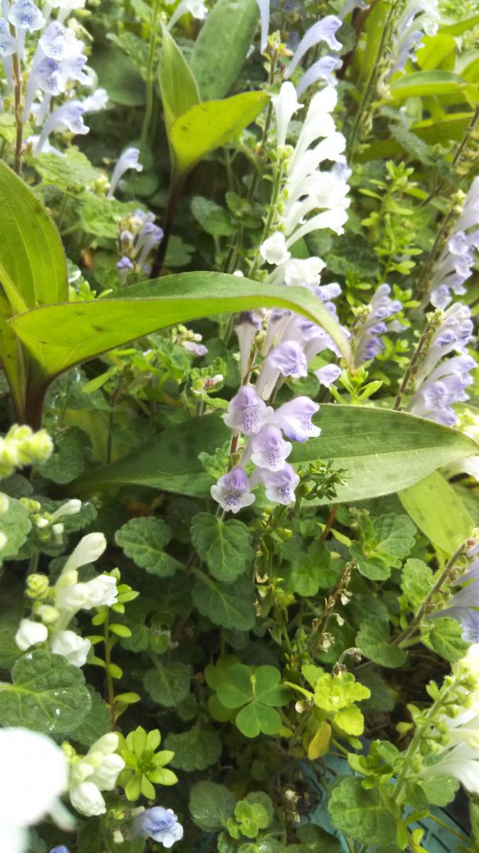 花壇から逃げ出して、野生化しているタツナミソウ(白と紫)とホトトギス。