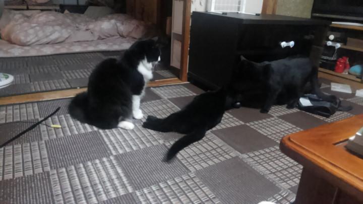 この間、本能で思い出したのか、首筋をくわえて上に乗ったものの、その先が分からなかったらしくプロレスになっちゃって、たまちゃんにシャーって怒られてるし。