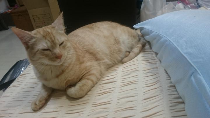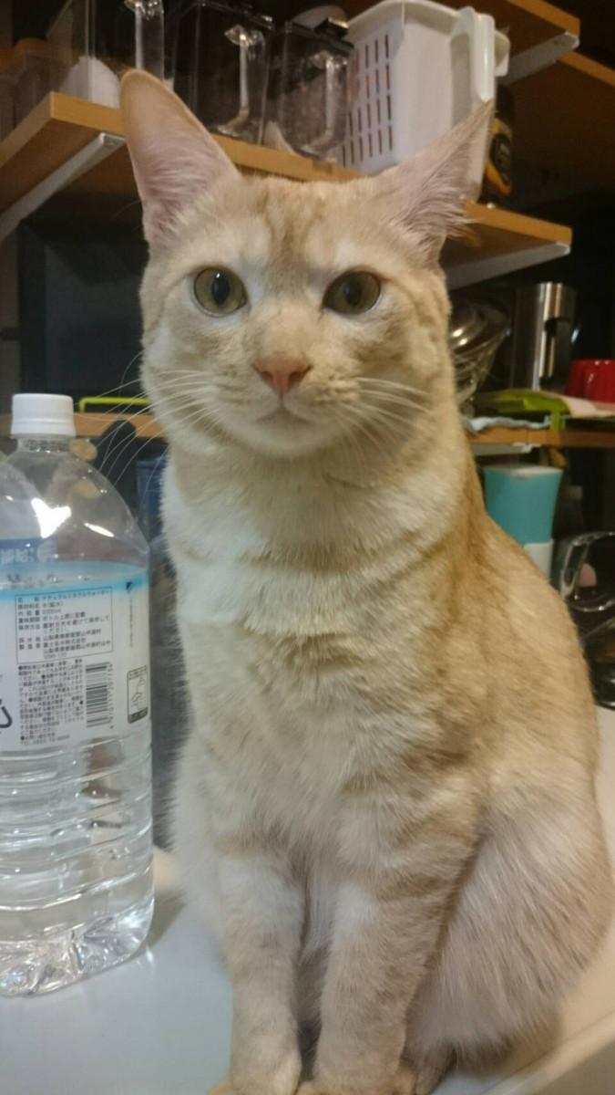 家内が続けて、マンションの管理会社が下の階でエアコンの室外機の下で、うずくまった猫をを見つけ、どうやら私のトコの猫らしいと、抱き抱えて連れてきてくれた様子。