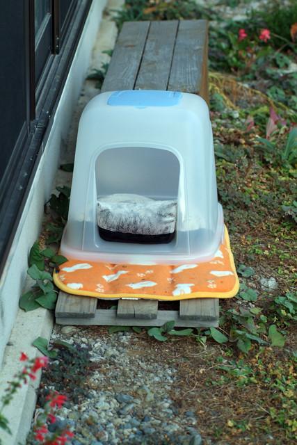 簡素なたたずまい、通気性を考えた廃材のスノコ、速乾性の高いマットに、クッション、こちらはリサイクル品になっております。フードは家主さん宅に放置されていたトイレフード。これで、雨風がしのげる構造になっております。