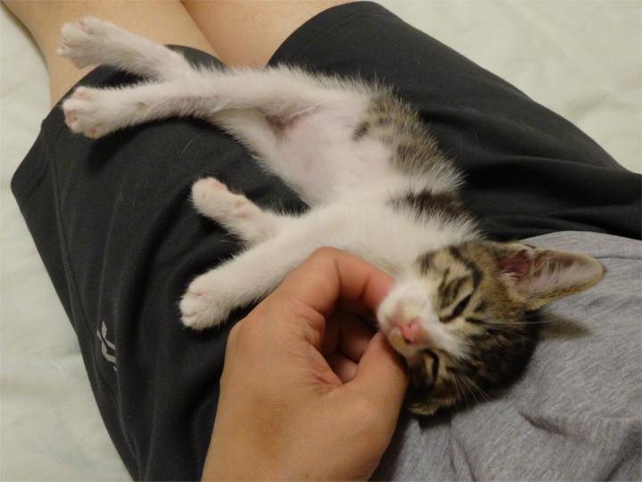 おっさんの膝の上で。すごく小さい音ですが、捕獲5日後にして初ゴロゴロが聞こえました。