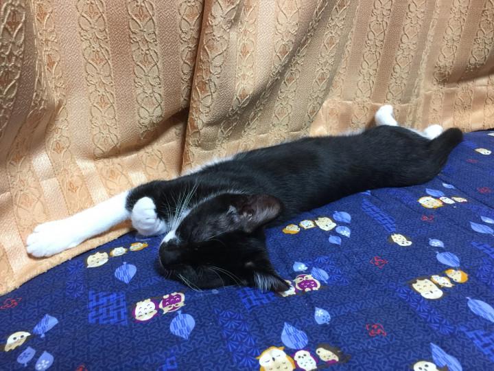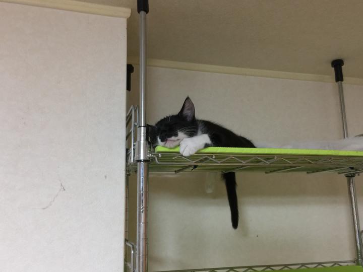 いつもは壁に背中を向けて寝るのですが、昨日は背中を手前に向けてねており、そのまま落下しキャットタワーの下のラックの角に背中をぶつけ、落ちました…。