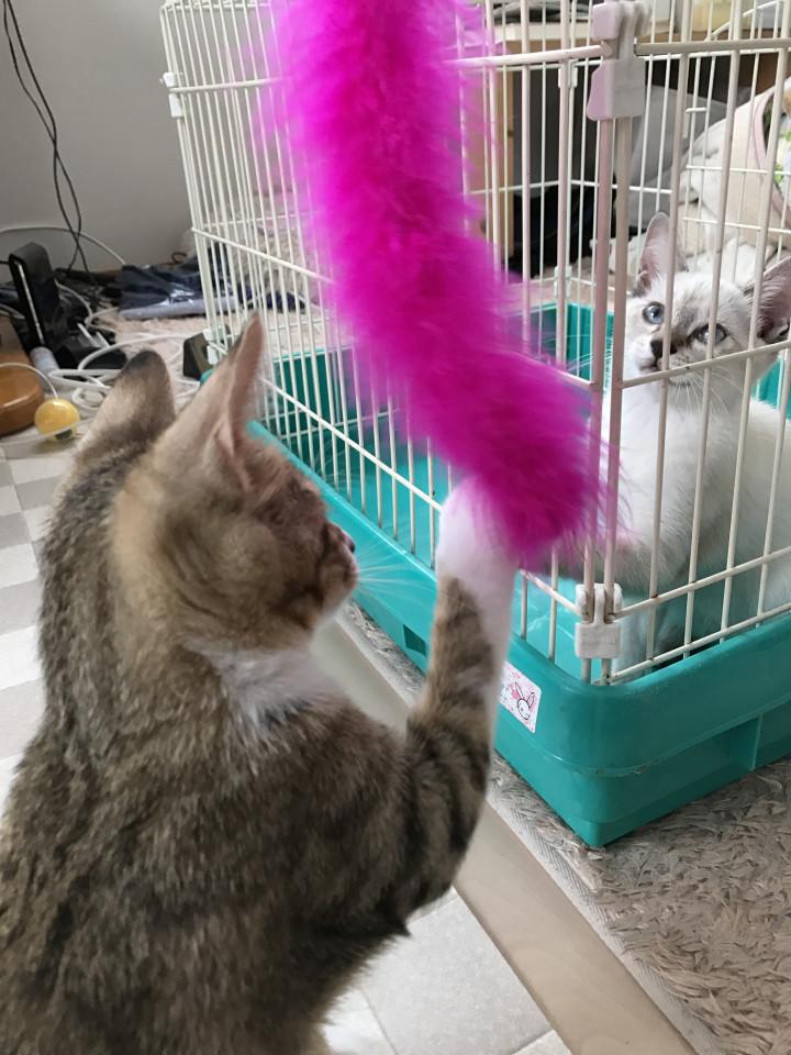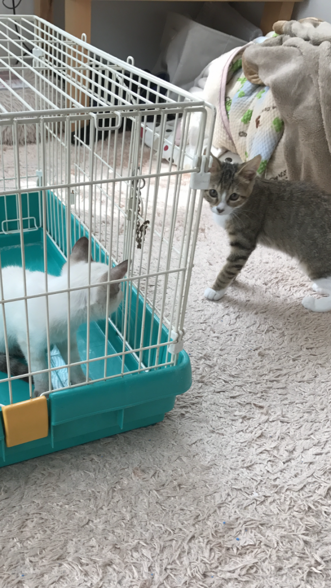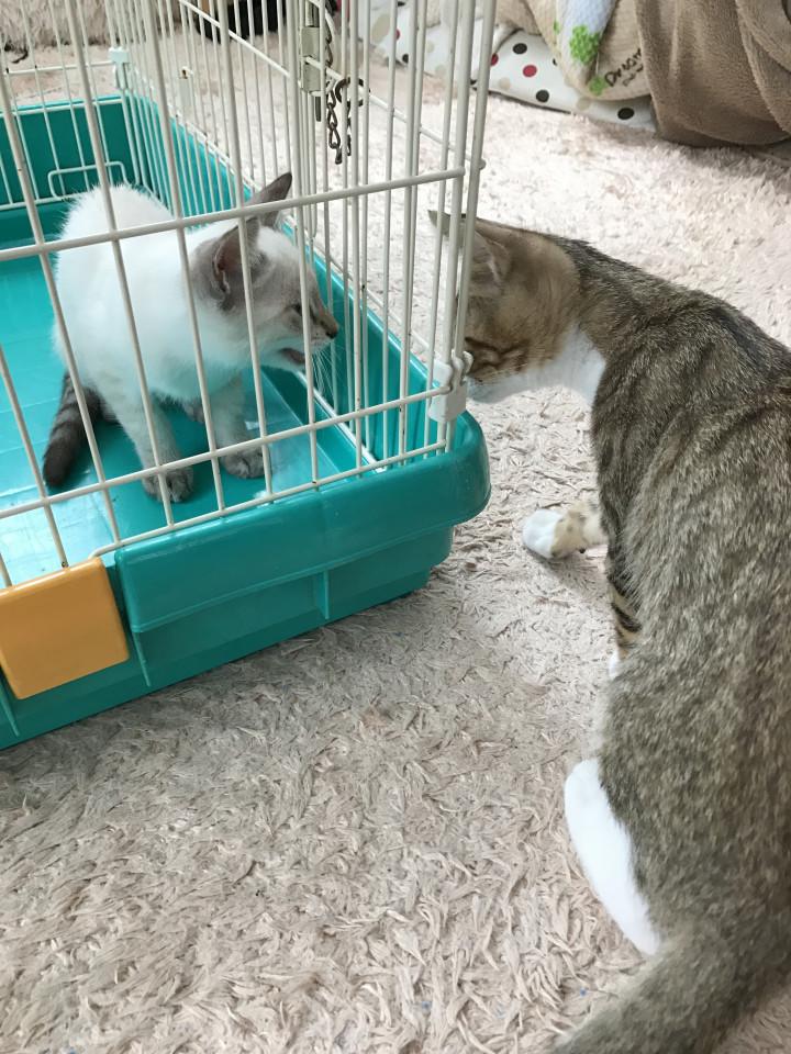 長男が今日ちょっとだけ、メルとマリをケージ越しに合わせてみようと言うので、心配でしたが、ケージ越しならとドキドキの初対面をさせました💦