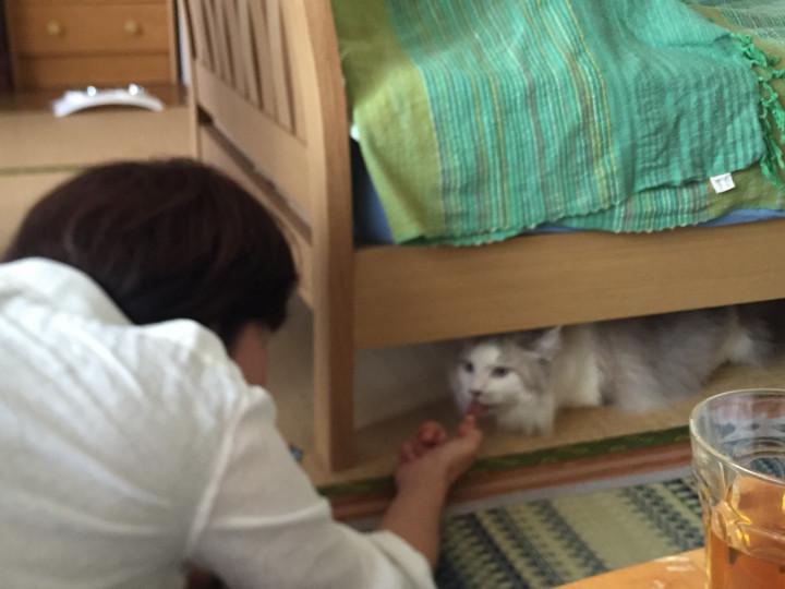 お邪魔した時間帯、いつもこのベットの下でお昼寝中とのことですが、呼ぶと「?」という表情で微動だにせず。