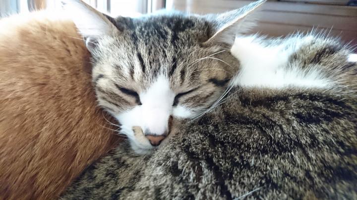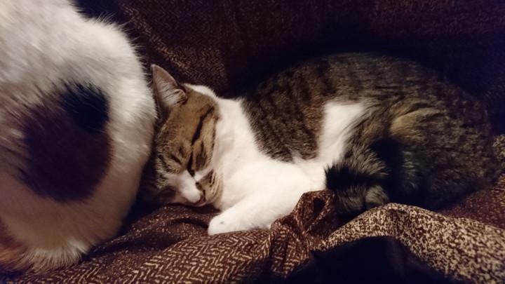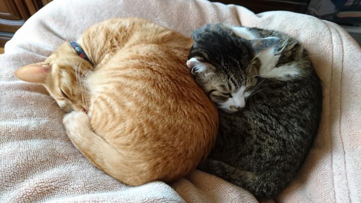 ちょびが寝てたところに茶太郎が来たようで、ちょびが潰され気味になってました‼️