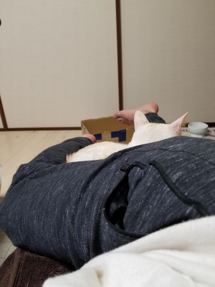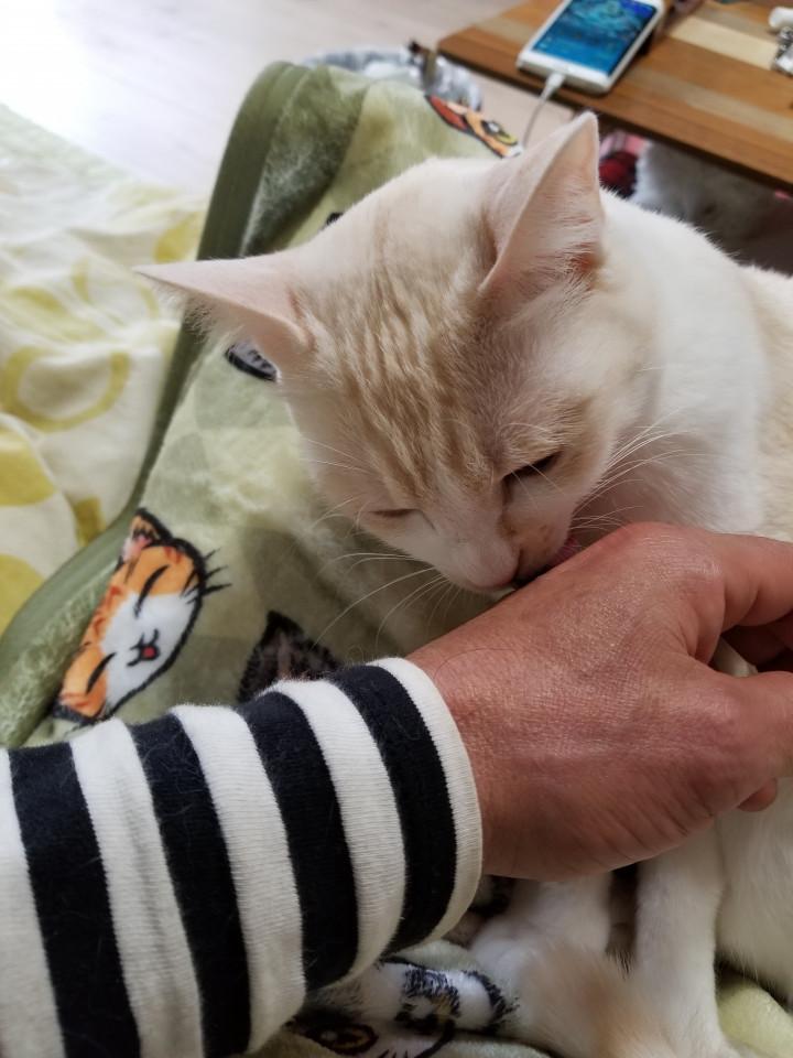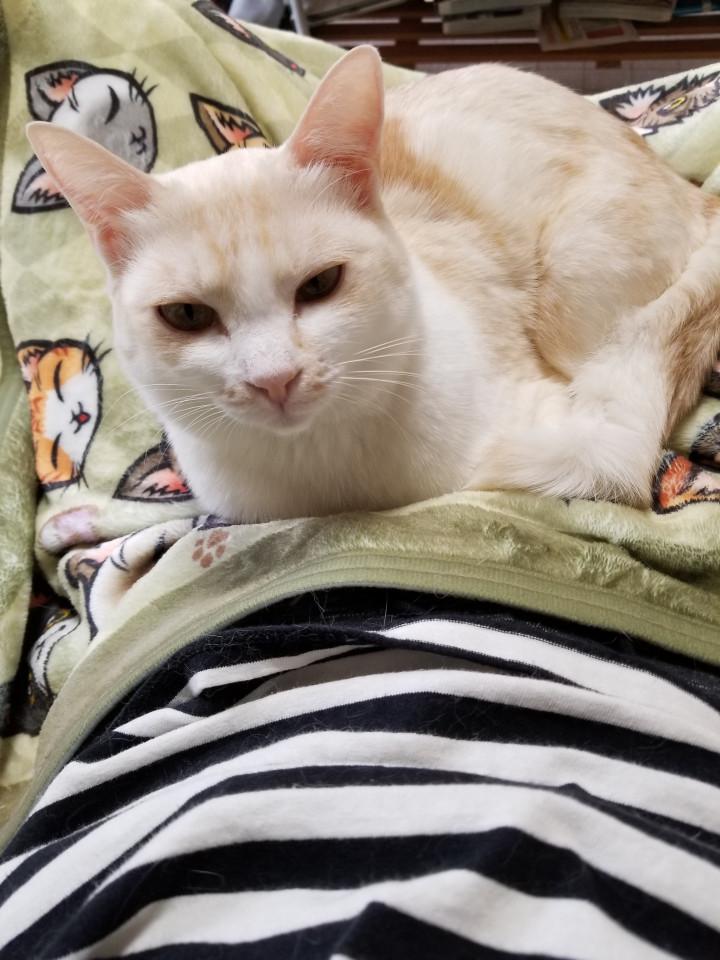 ご褒美に膝の上で寝てあげてるの(^-^)
