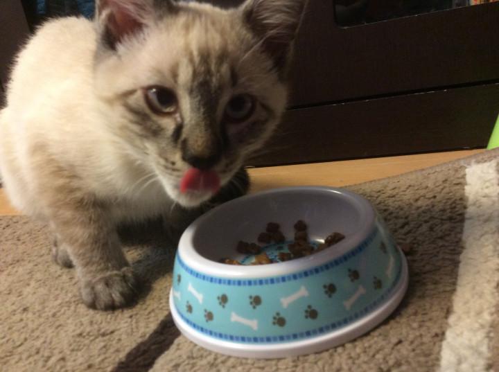 帰宅後、一心不乱にカリカリを食べるユキ。