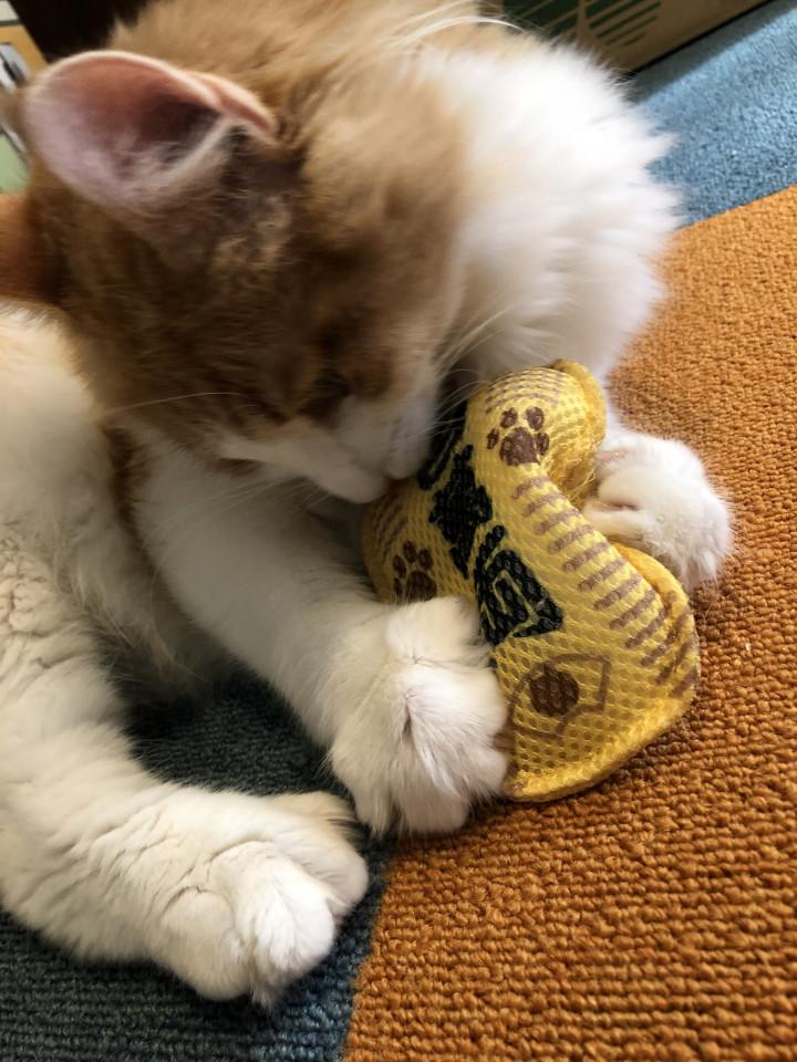写真はけりぐるみの百万両をハミハミするヒノさん。先日、体重が5.3キロありました!何キロまで育つかしら。