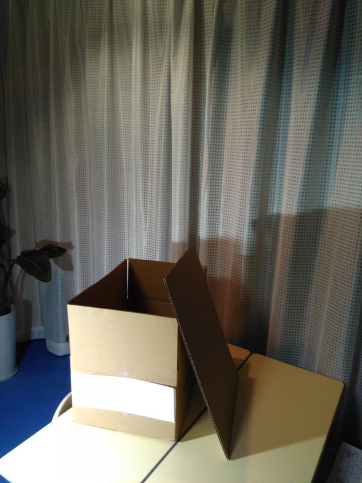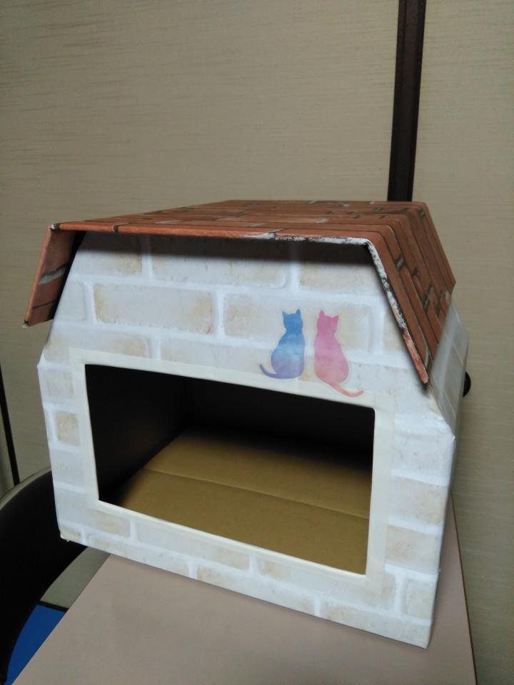 待っているあいだに、段ボール箱で猫ちゃんハウスを作ってみました。