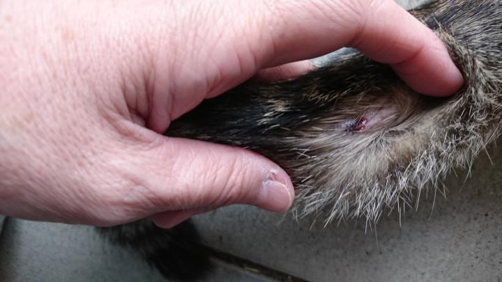 その場ですぐ消毒し、傷薬は塗ったのですが、、やはり心配で、、獣医さんへいき、処方してもらい一週間くすりをのませ、綺麗に治りました。