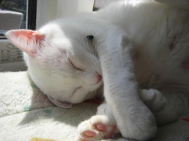 同じころ美々ちゃんは出窓でお日様をいっぱい浴びてスヤスヤ